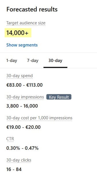 Optimal range for B2B SaaS: 10.000 to 50.000 people. Below 10.000, your CPM will climb steeply. Above 100.000, your message gets diluted across too many people who only loosely match your ICP.